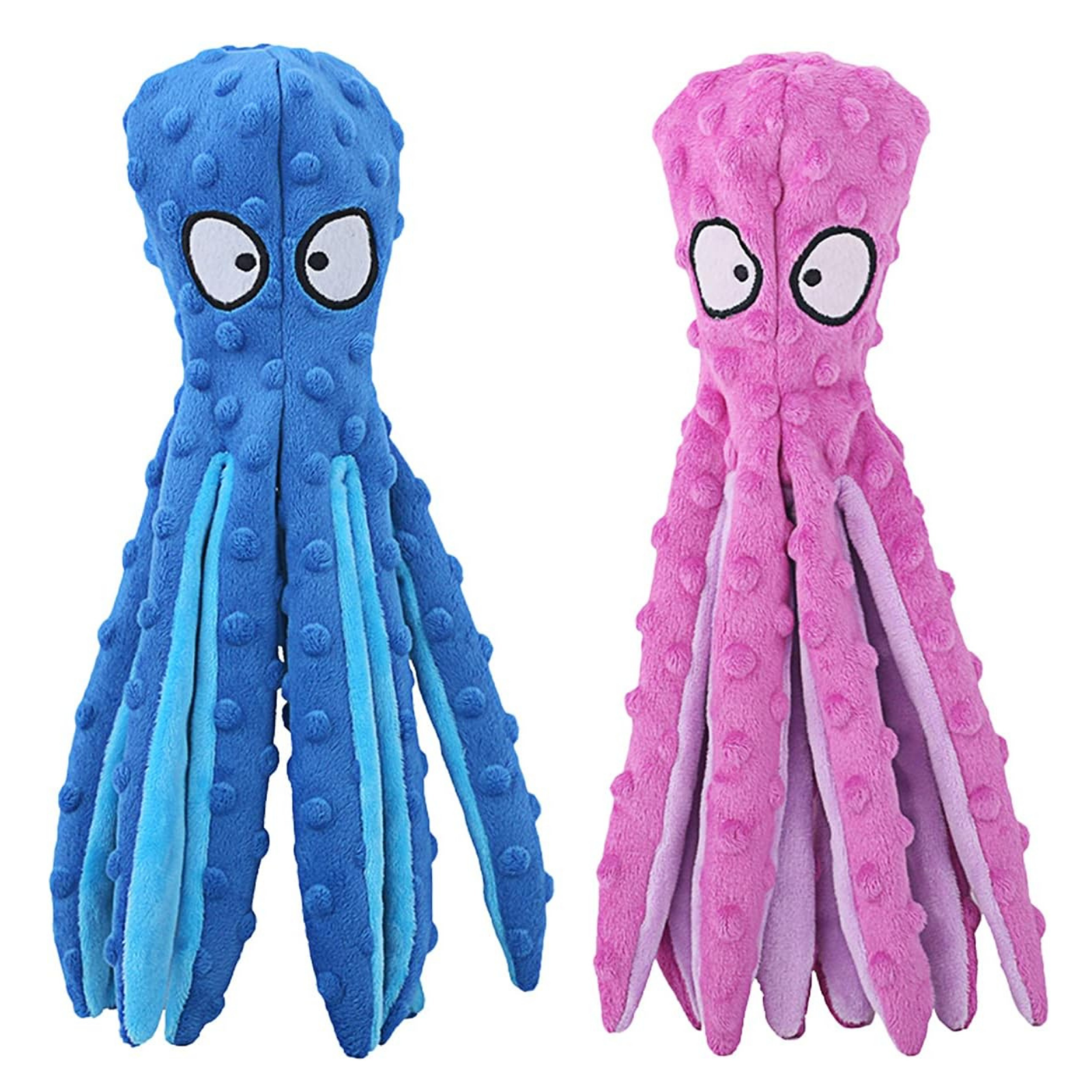 This 2-pack of bright, octopus-shaped dog toys is soft, lightweight, and designed for interactive fun. With long legs ideal for tug, fetch, and shaking, they are easy for dogs of all sizes to carry and play with. Built-in squeakers and crinkle paper provide engaging sounds that help keep pets active, entertained, and mentally stimulated.